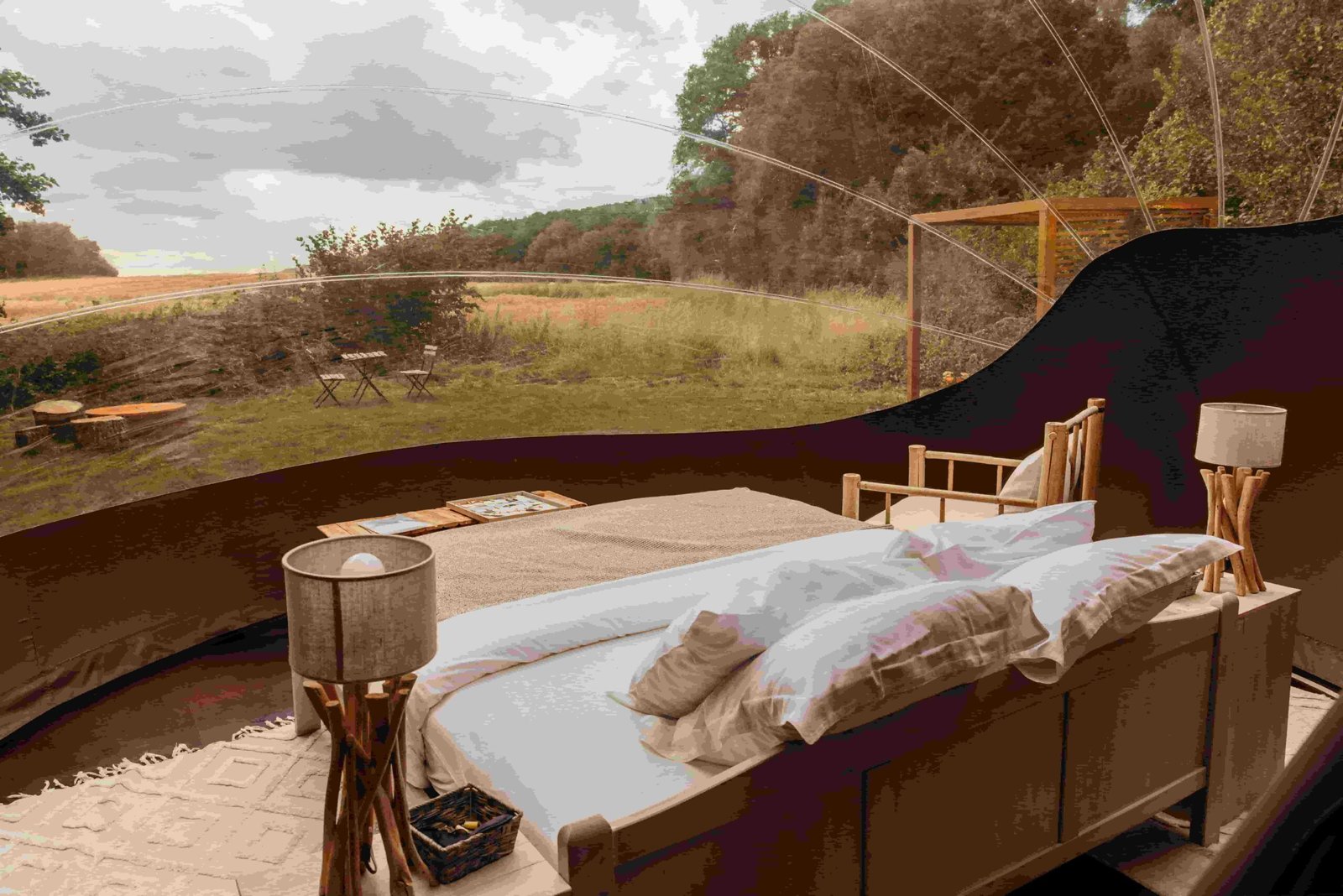 Immerse yourself in the magical intimacy of the Dôme des Libellules – an unusual retreat in the heart of nature, designed for a romantic getaway. Featuring a heated king-size bed and private terrace, this space offers luxury and serenity. Nestling in the corner of a wood, the secluded site is perfect for total disconnection. You’ll spend an unforgettable night under the stars, lulled by the magic of nature. A bunk bed is available in the small cabin next door, ideal for children. There’s also a brazier and BBQ for cosy evenings. Book now and let yourself be swept away by the tranquillity of the Dôme des Libellules.